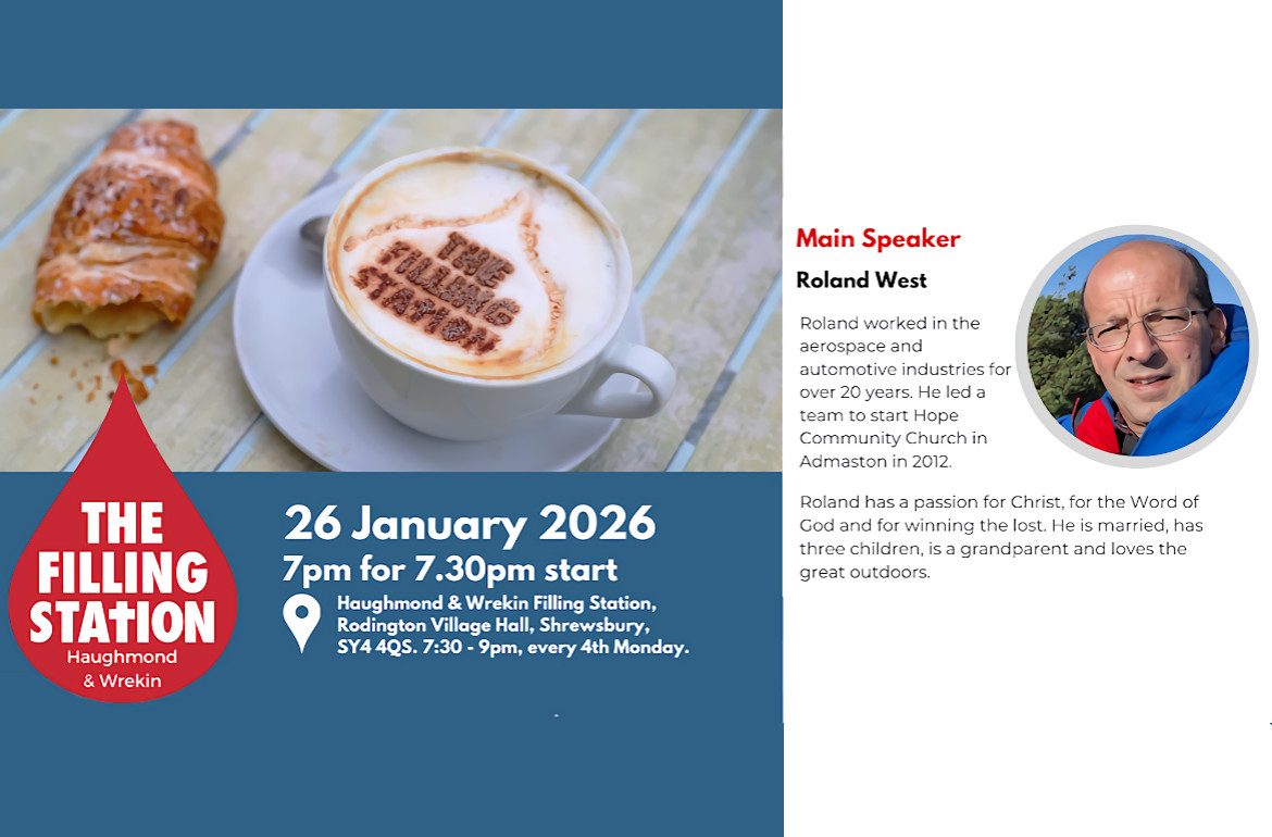 HAUGHMOND AND WREKIN FILLING STATION meets at Rodington Village Hall on the fourth Monday of the month. The meeting starts at 7.30pm but turn up after 7pm for refreshments beforehand. On Monday 26 January the speaker will be Roland West. He worked in the aerospace and automotive industries for over twenty years, and led a team to start Hope Community Church at Admaston in 2012. Roland has a passion for Christ, for the Word of God and for winning the lost. He is married, has three children, is a grandparent and loves the great outdoors. Everyone welcome.