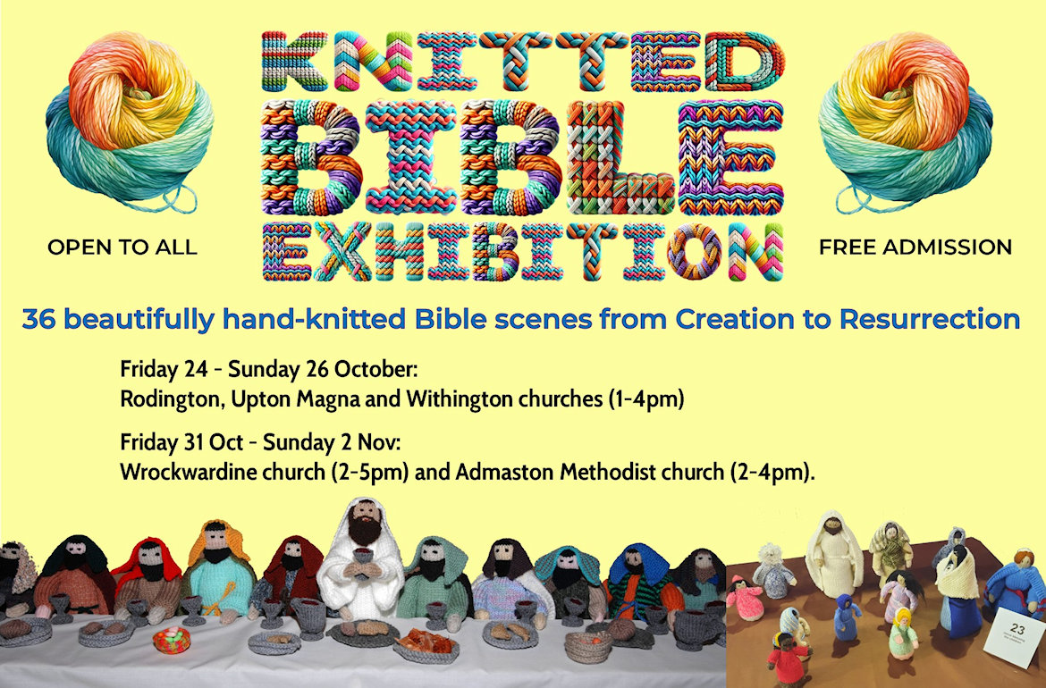Until Sunday 1 November, the benefice will display a KNITTED BIBLE EXHIBITION of 36 table-top scenes depicting some of the best-known stories in the Bible ranging from Noah and his ark, Daniel in the lion’s den, and Jonah and the whale to the Christmas and Easter stories. It will be hosted at various locations across the benefice. If you missed the exhibition at Buildwas,Eaton Constantine or High Ercall, you can still see it at other churches: