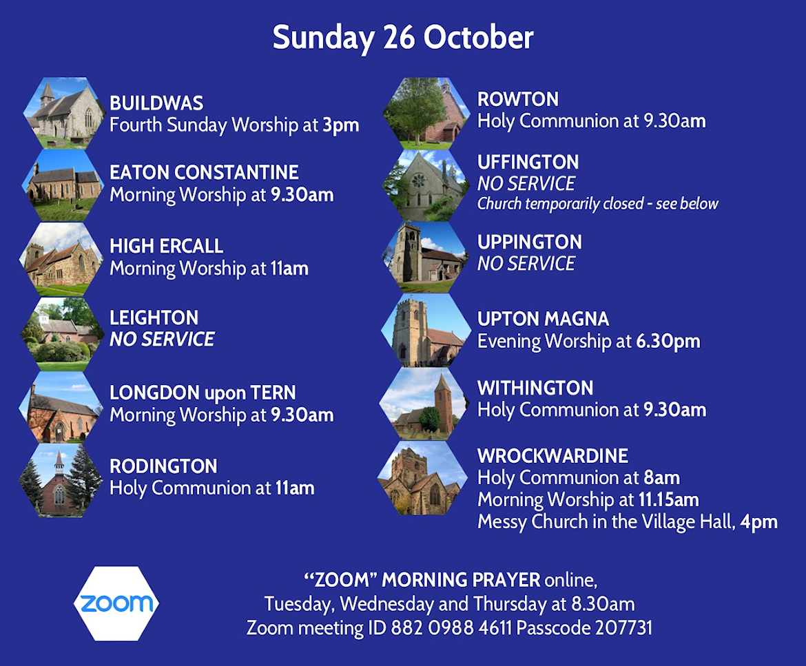 Friday 24 - Sunday 26 October: Rodington, Upton Magna and Withington churches (1-4pm)