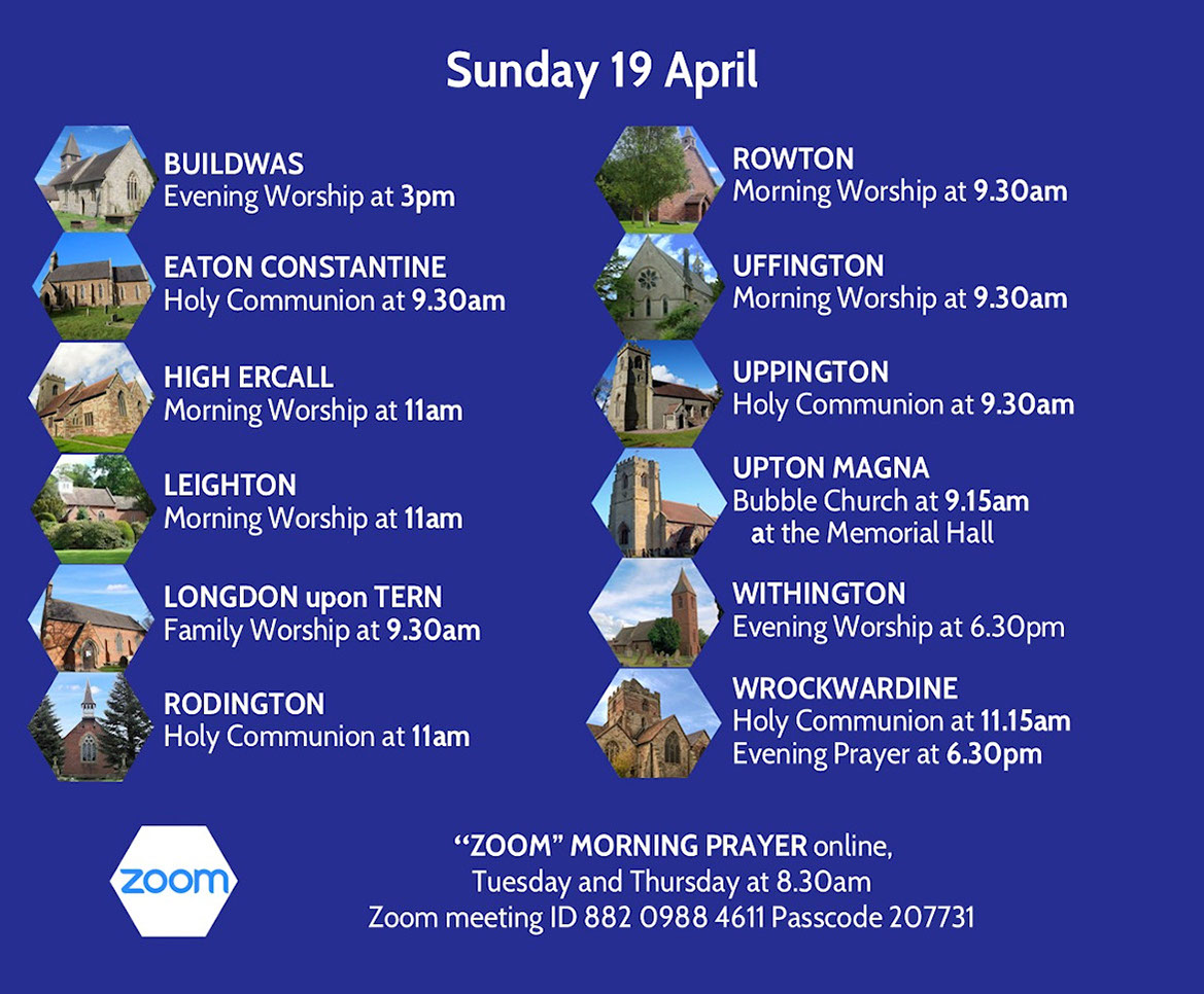 There are a number of regular COFFEE MORNINGS each month, including Rodington Church every Wednesday from 10.30 - 11.30am, Withington Parish Room on Wednesday 1 April (10.30am to 12 noon), Wrockwardine Church on Tuesday 7 April (10am to 12noon) and Eaton Constantine Village Hall on Monday 13 April (10am to 12noon).