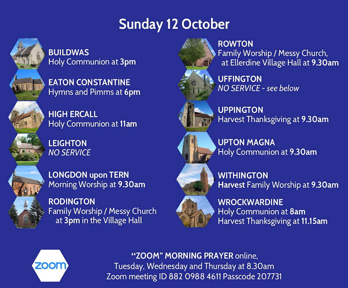 There are a number of regular COFFEE MORNINGS each month, including Rodington Church every Wednesday from 10.30 - 11.30am, Withington Parish Room on Wednesday 1 October (10.30am to 12 noon), Eaton Constantine Village Hall on Monday 6 October (10am to 12noon) and Wrockwardine Church on Tuesday 7 October(10am to 12noon).